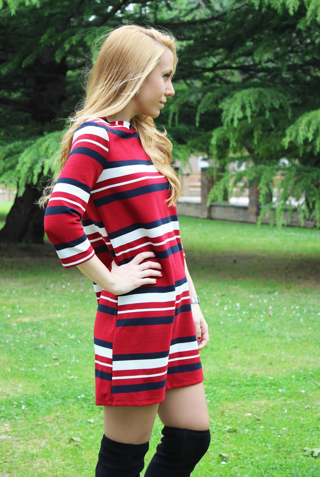 Me encanta este vestido. El color rojo, las rayas, el corte... Lo primero que pensé al comprarlo fue en combinarlo con mis botas altas. Es una mezcla que me encanta y que ahora es tendencia, me encantó el resultado.